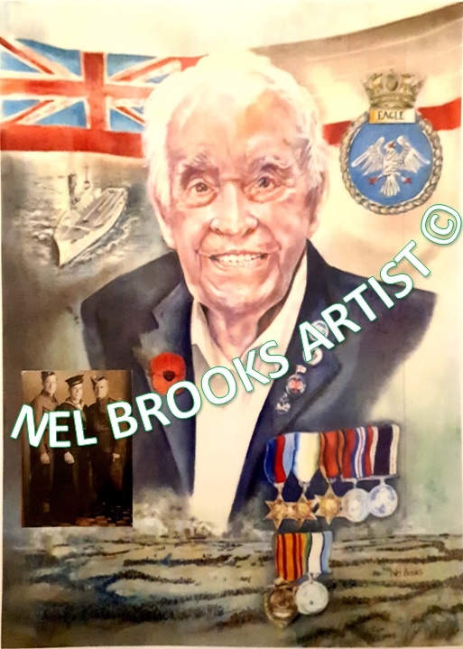 Lawrence was part of the 1939 British Expeditionary Force and took part in the Dunkirk evacuation (Operation Dynamo) in 1939. He went on to serve the remainder of the war (along with his brothers, George and Edward, shown in the photo in his portrait). He served on HMS Eagle (just prior to it being sunk) among other Royal Navy vessels.