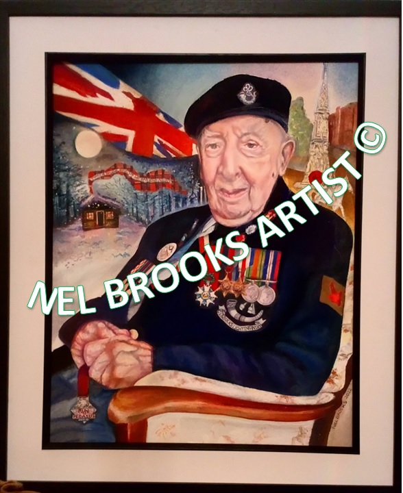 Nel has incorporated a cabin in Reg's portrait as this was one of the tails Reg spoke of about his experiences during the war!